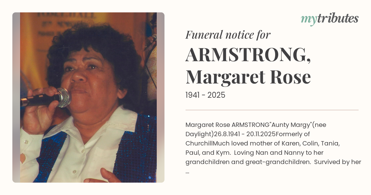 Family and friends are invited to attend a service to remember the life and love of Margaret to be held at 10.30 a.m. Friday 12th December 2025 in the Chapel of Ipswich Crematorium at Warrill Park Lawn Cemetery, Anderson-Day Drive, Willowbank.