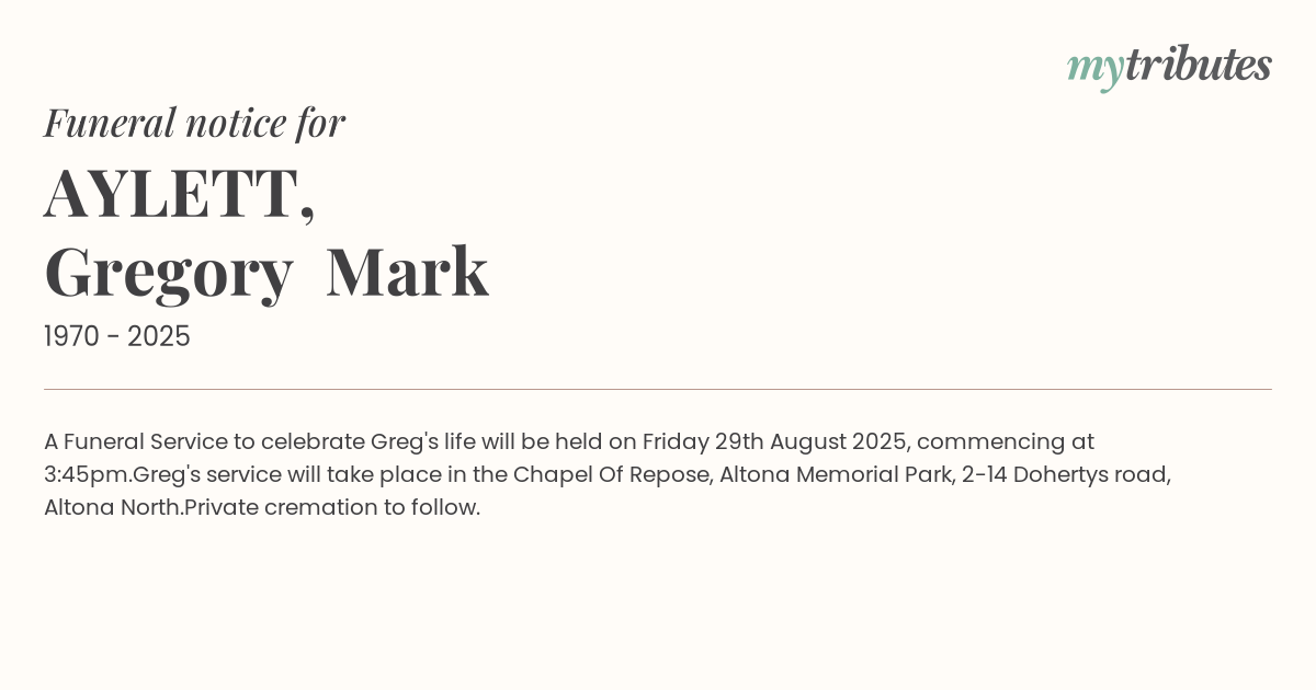18°CA Funeral Service to celebrate Greg's life will be held on Friday 29th August 2025, commencing at 3:45pm.