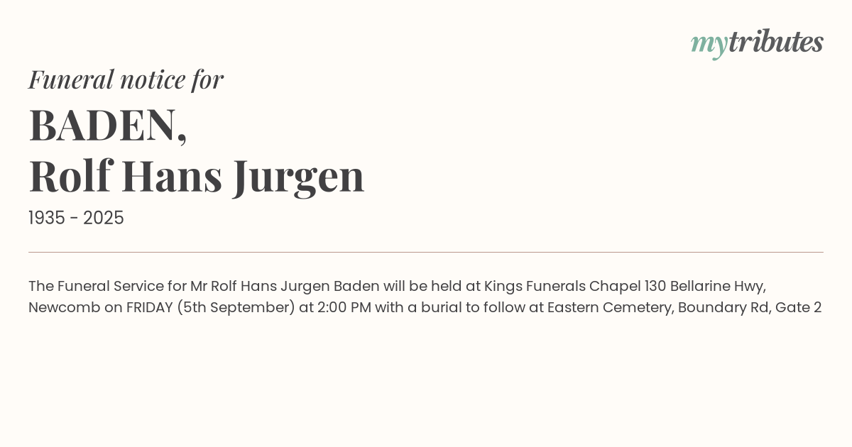 18°CThe Funeral Service for Mr Rolf Hans Jurgen Baden will be held at Kings Funerals Chapel 130 Bellarine Hwy, Newcomb on FRIDAY (5th September) at 2:00 PM with a burial to follow at Eastern Cemetery, Boundary Rd, Gate 2