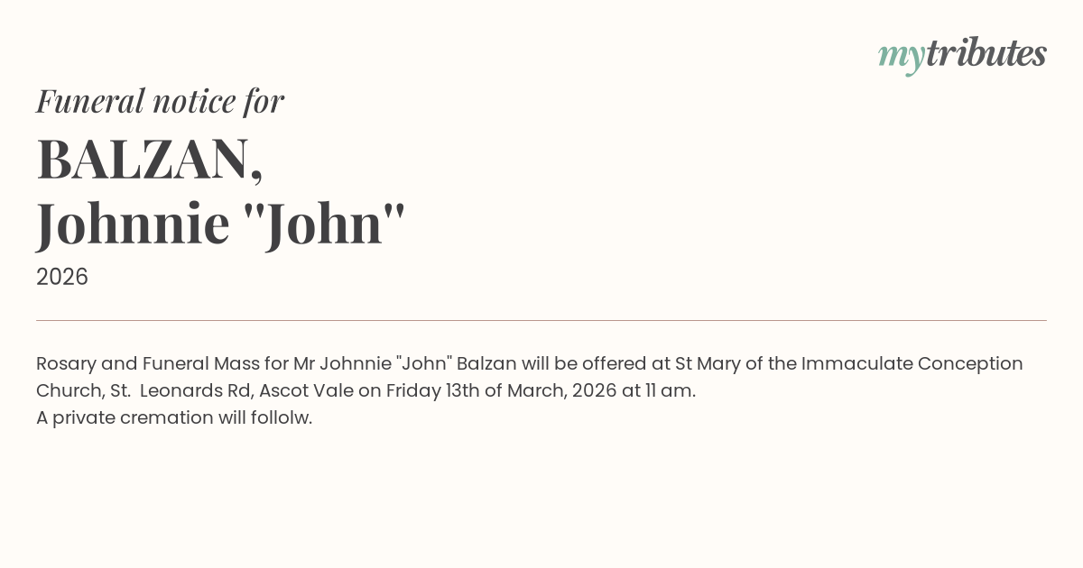 18°CRosary and Funeral Mass for Mr Johnnie ''John'' Balzan will be offered at St Mary of the Immaculate Conception Church, St. Leonards Rd, Ascot Vale on Friday 13th of March, 2026 at 11 am.
