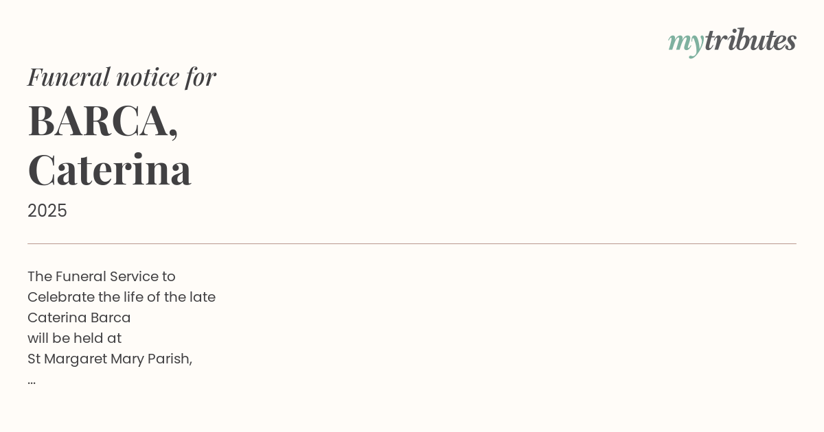 18°CThe Funeral Service to Celebrate the life of the late Caterina Barca will be held at St Margaret Mary Parish, 51 Mitchell Street, Brunswick North, Victoria on Friday 27th June, 2025 commencing at 11am. Followed by a Burial at Fawkner Memorial Park.