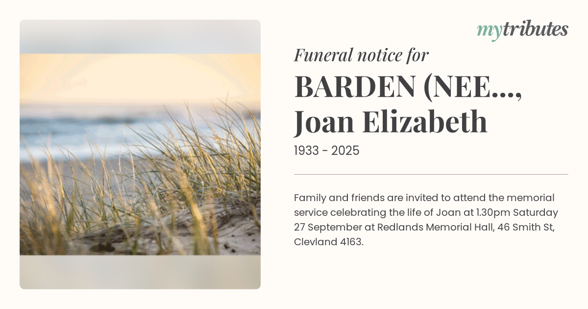 18°CFamily and friends are invited to attend the memorial service celebrating the life of Joan at 1.30pm Saturday 27 September at Redlands Memorial Hall, 46 Smith St, Clevland 4163.