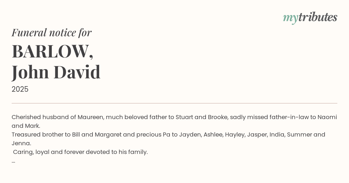 Please join us for a memorial service honouring John’s life on Friday 29th August 2025 in South Chapel, Woronora Memorial Park, Linden St, Sutherland at 10am. Followed by a reception at Celeste Cottage, located within the cemetery.