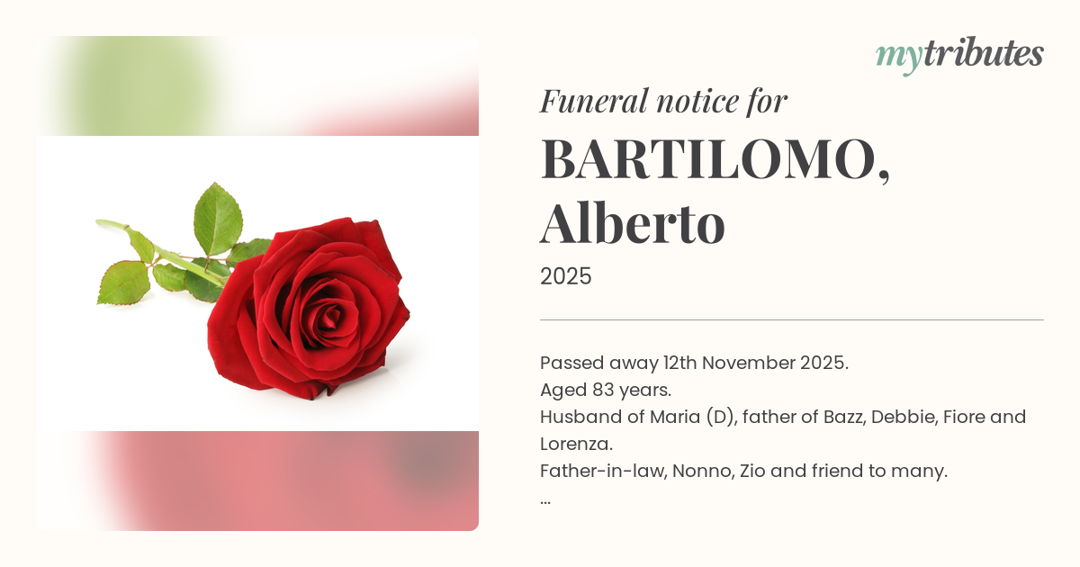 18°CPassed away 12th November 2025. Aged 83 years. Husband of Maria (D), father of Bazz, Debbie, Fiore and Lorenza. Father-in-law, Nonno, Zio and friend to many. A celebration of Alberto's life will be held at St John the Baptist Catholic Church, 133 S Pine Road, Enoggera, on Monday 24th November, at 10.30 a.m., followed by burial at Nudgee Cemetery.