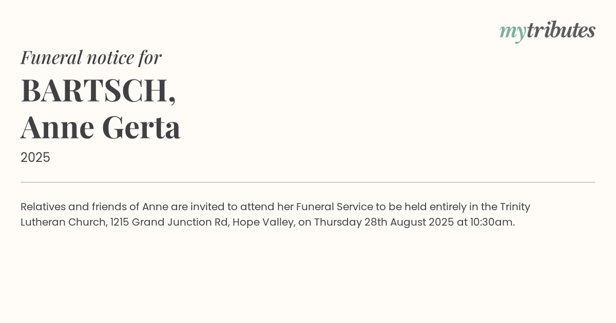 18°CRelatives and friends of Anne are invited to attend her Funeral Service to be held entirely in the Trinity Lutheran Church, 1215 Grand Junction Rd, Hope Valley, on Thursday 28th August 2025 at 10:30am.