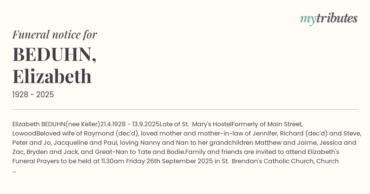 Family and friends are invited to attend Elizabeth's Funeral Prayers to be held at 11.30am Friday 26th September 2025 in St. Brendan's Catholic Church, Church Street, Lowood. Service complete in the church, private cremation.