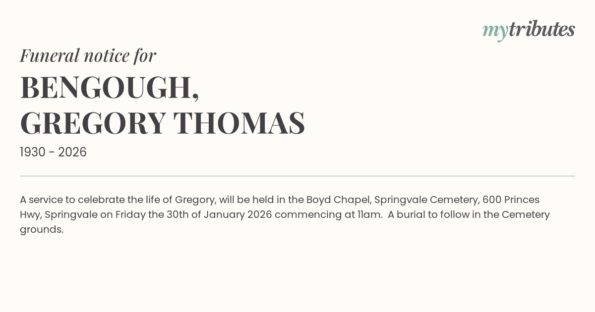 18°CA service to celebrate the life of Gregory, will be held in the Boyd Chapel, Springvale Cemetery, 600 Princes Hwy, Springvale on Friday the 30th of January 2026 commencing at 11am. A burial to follow in the Cemetery grounds.