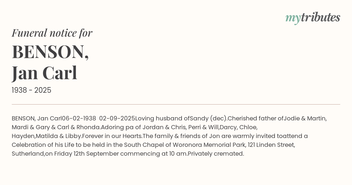 attend a Celebration of his Life to be held in the South Chapel of Woronora Memorial Park, 121 Linden Street, Sutherland,