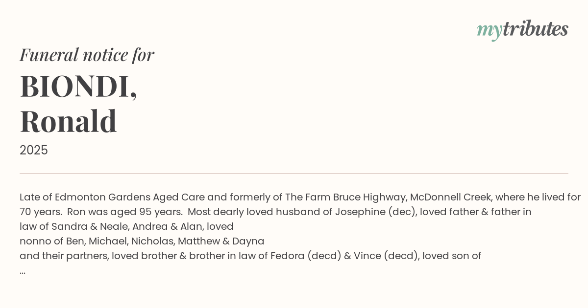 All family, relatives and friends of RONALD BIONDI are respectfully invited to attend his funeral service, which will be held on FRIDAY MORNING 29th August 2025, commencing at 10.00am in the Chapel of Heritage Brady Funeral Directors 76 Maher