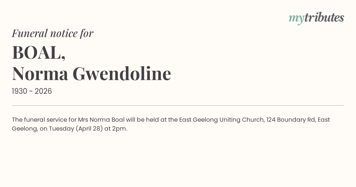 18°CThe funeral service for Mrs Norma Boal will be held at the East Geelong Uniting Church, 124 Boundary Rd, East Geelong, on Tuesday (April 28) at 2pm.