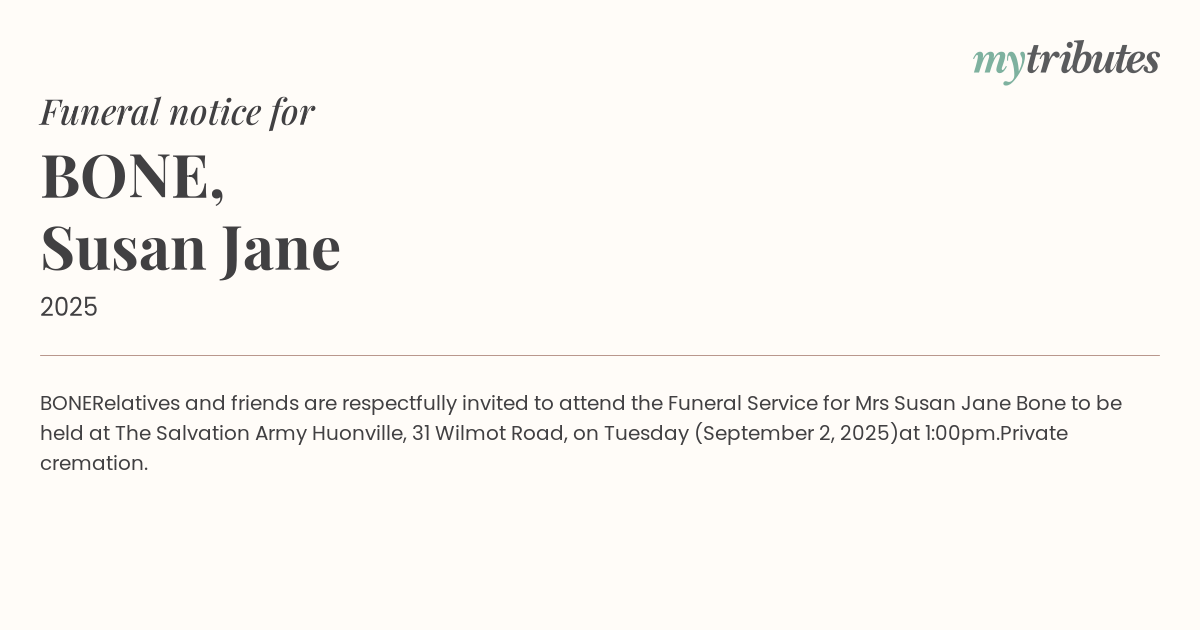 Relatives and friends are respectfully invited to attend the Funeral Service for Mrs Susan Jane Bone to be held at The Salvation Army Huonville, 31 Wilmot Road, on Tuesday (September 2, 2025)