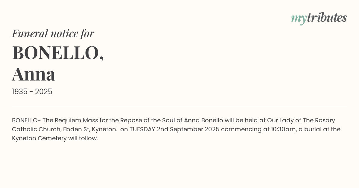 18°CBONELLO- The Requiem Mass for the Repose of the Soul of Anna Bonello will be held at Our Lady of The Rosary Catholic Church, Ebden St, Kyneton. on TUESDAY 2nd September 2025 commencing at 10:30am, a burial at the Kyneton Cemetery will follow.