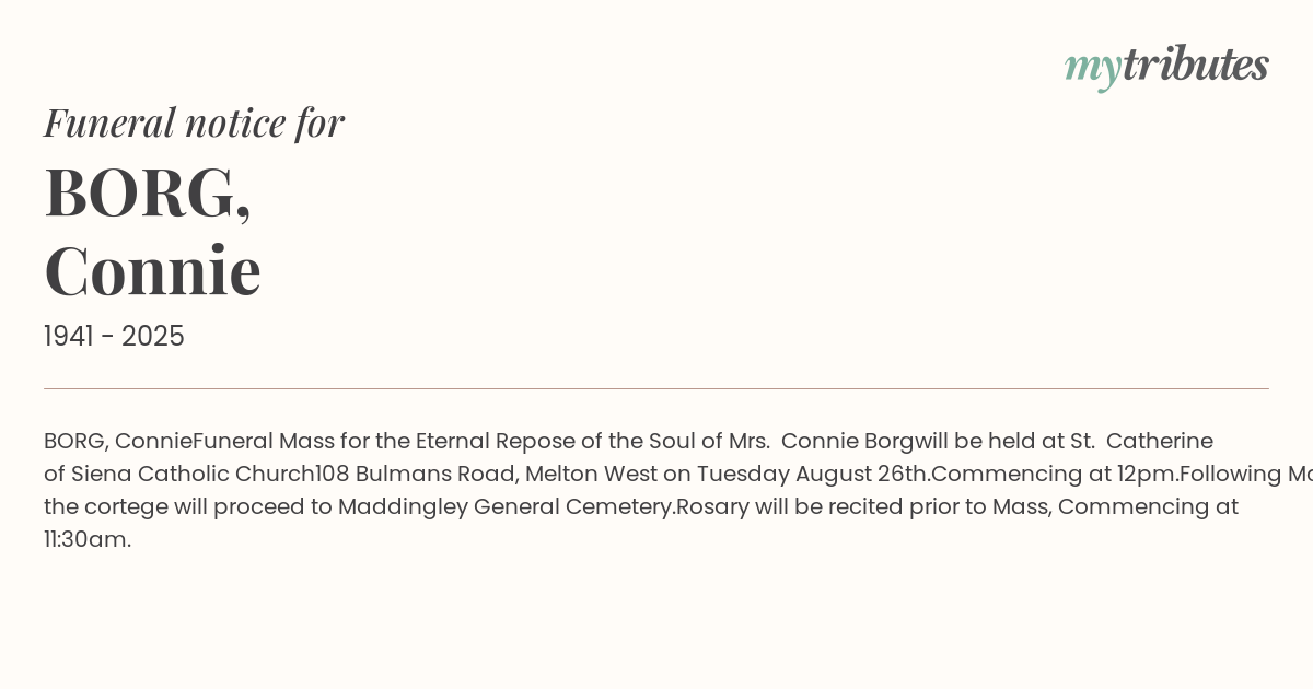 Following Mass the cortege will proceed to Maddingley General Cemetery.