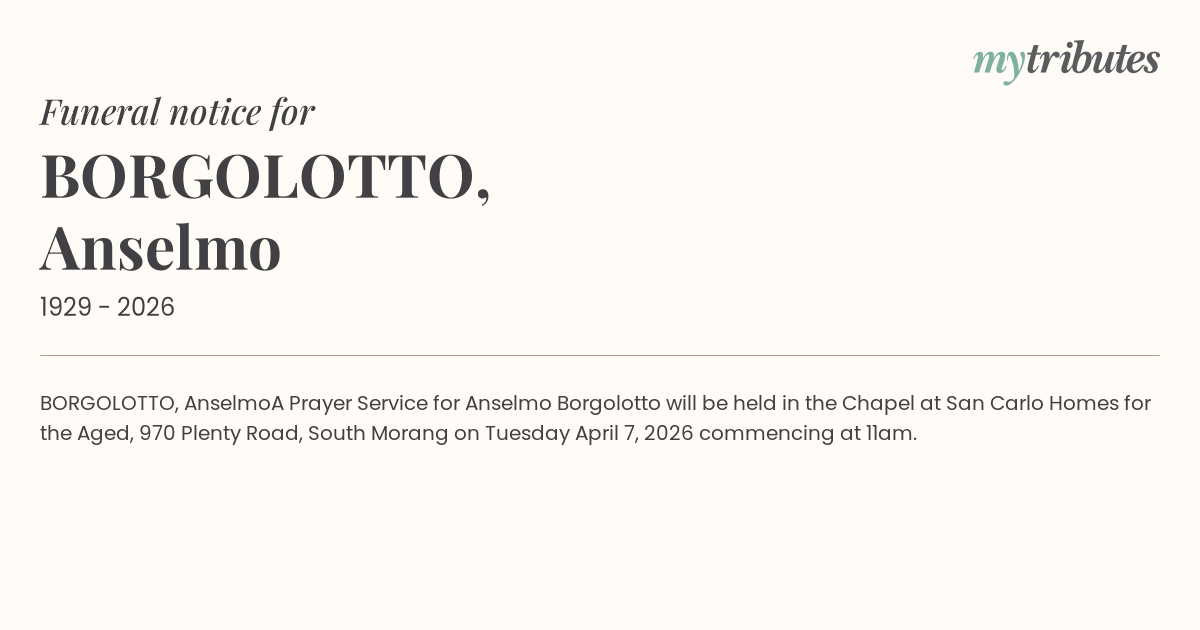 A Prayer Service for Anselmo Borgolotto will be held in the Chapel at San Carlo Homes for the Aged, 970 Plenty Road, South Morang on Tuesday April 7, 2026 commencing at 11am.
