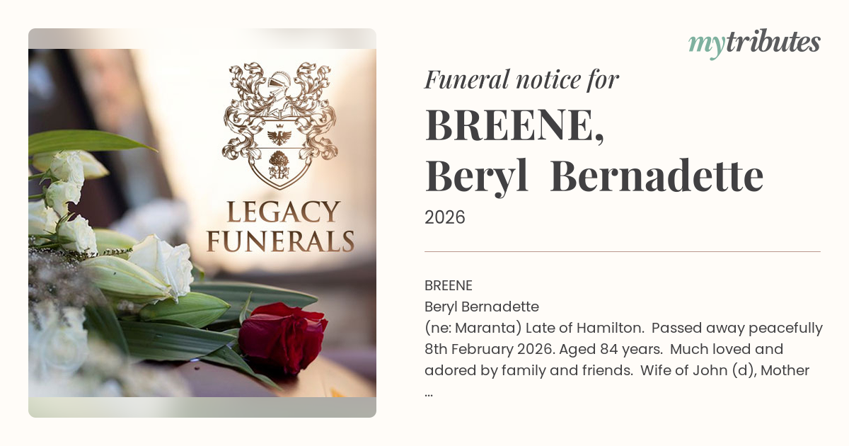 Late of Hamilton. Passed away peacefully 8th February 2026. Aged 84 years. Much loved and adored by family and friends. Wife of John (d), Mother of Nicola, Jonathan, Michael and David; Mother in Law of Michael, Criselda and Anni; Grandmother of Michael (d), Georgina, Dominique, Patrick, Baye, Jaya, Rali, Ella and Jack. A Requiem Mass for BB will be held at Our Lady Help of Christians Catholic Church, 9 Bowman St, Hendra at 10:30am on Wednesday, 4th March 2026 and followed by a private burial.