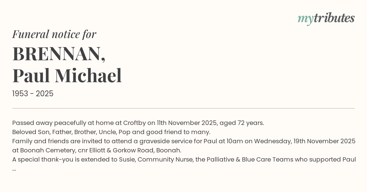 Family and friends are invited to attend a graveside service for Paul at 10am on Wednesday, 19th November 2025 at Boonah Cemetery, cnr Elliott & Gorkow Road, Boonah.
