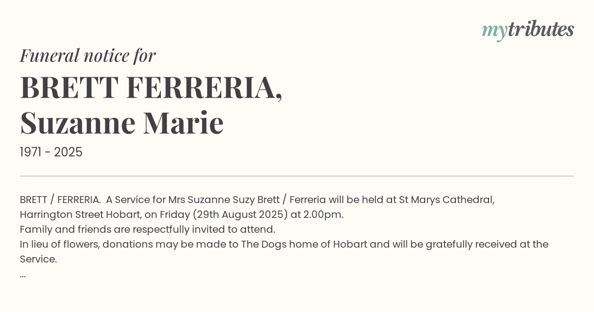 18°CBRETT / FERRERIA. A Service for Mrs Suzanne ‘Suzy’ Brett / Ferreria will be held at St Mary’s Cathedral, Harrington Street Hobart, on Friday (29th August 2025) at 2.00pm.