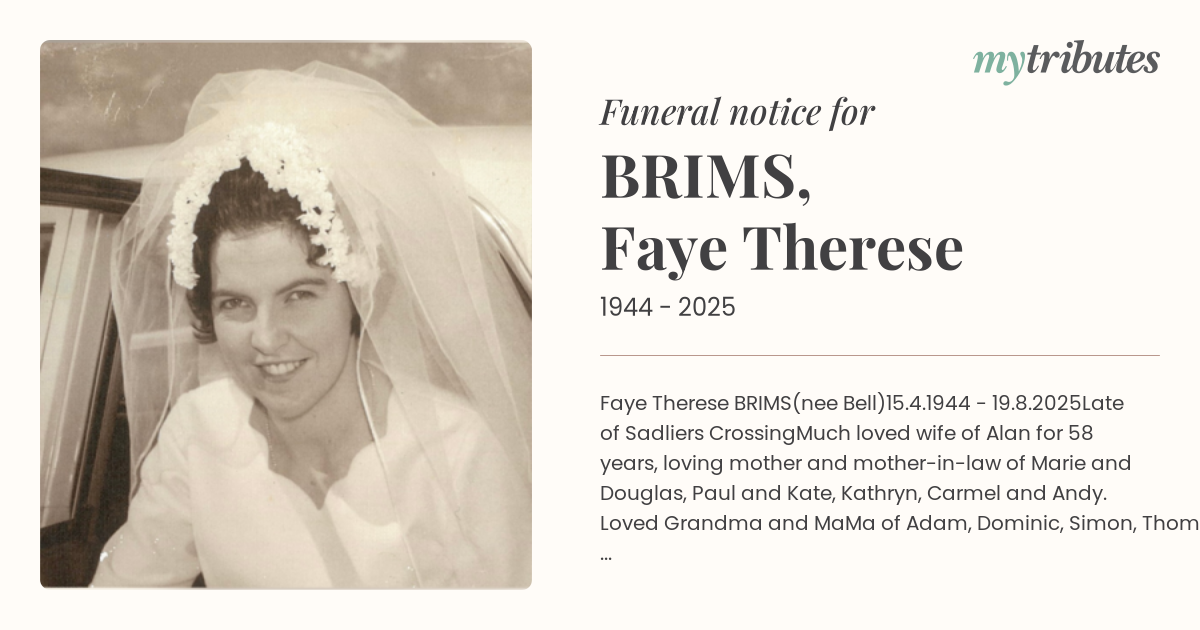 Much loved wife of Alan for 58 years, loving mother and mother-in-law of Marie and Douglas, Paul and Kate, Kathryn, Carmel and Andy. Loved Grandma and MaMa of Adam, Dominic, Simon, Thomas, Natalie, Claire, and Jonathon, Great-Grandma of Riley. Sister-in-law of Michael and Debbie Brims, and aunt of Felicity and Marcus.