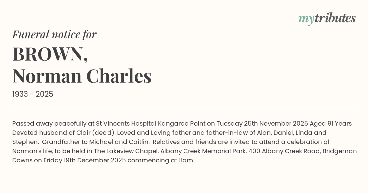 18°CPassed away peacefully at St Vincents Hospital Kangaroo Point on Tuesday 25th November 2025 Aged 91 Years Devoted husband of Clair (dec'd). Loved and Loving father and father-in-law of Alan, Daniel, Linda and Stephen. Grandfather to Michael and Caitlin. Relatives and friends are invited to attend a celebration of Norman's life, to be held in The Lakeview Chapel, Albany Creek Memorial Park, 400 Albany Creek Road, Bridgeman Downs on Friday 19th December 2025 commencing at 11am.