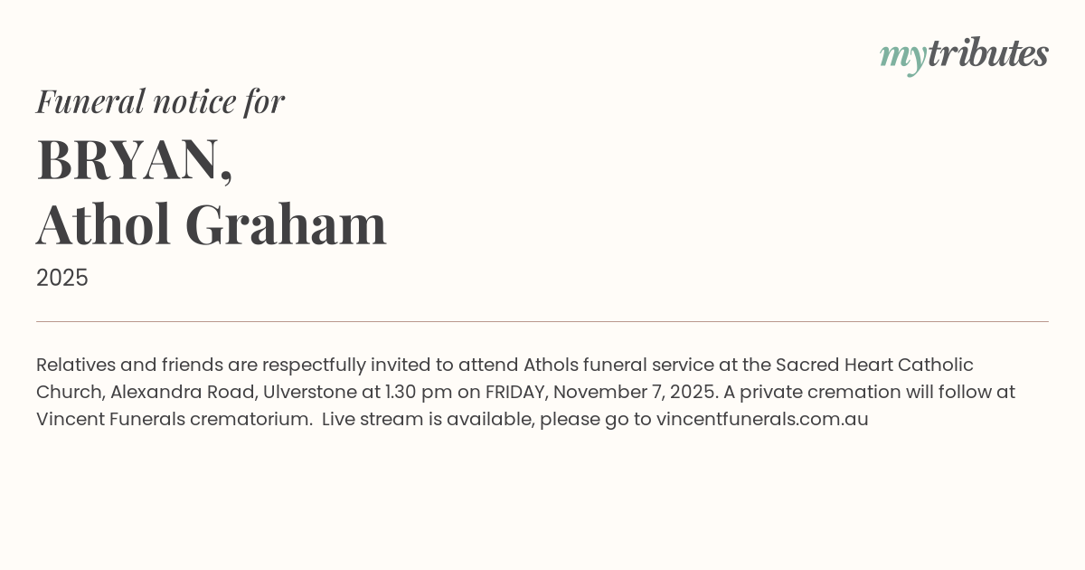 18°CRelatives and friends are respectfully invited to attend Athol’s funeral service at the Sacred Heart Catholic Church, Alexandra Road, Ulverstone at 1.30 pm on FRIDAY, November 7, 2025. A private cremation will follow at Vincent Funerals crematorium. Live stream is available, please go to vincentfunerals.com.au