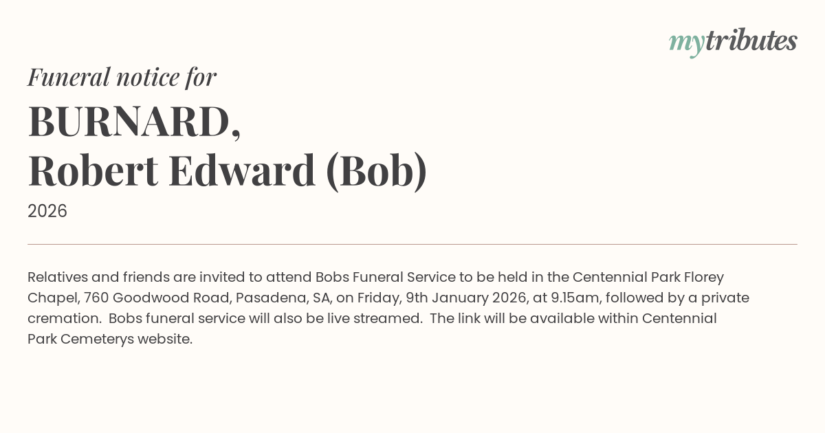 18°CRelatives and friends are invited to attend Bob’s Funeral Service to be held in the Centennial Park Florey Chapel, 760 Goodwood Road, Pasadena, SA, on Friday, 9th January 2026, at 9.15am, followed by a private cremation. Bob’s funeral service will also be live streamed. The link will be available within Centennial Park Cemetery’s website.