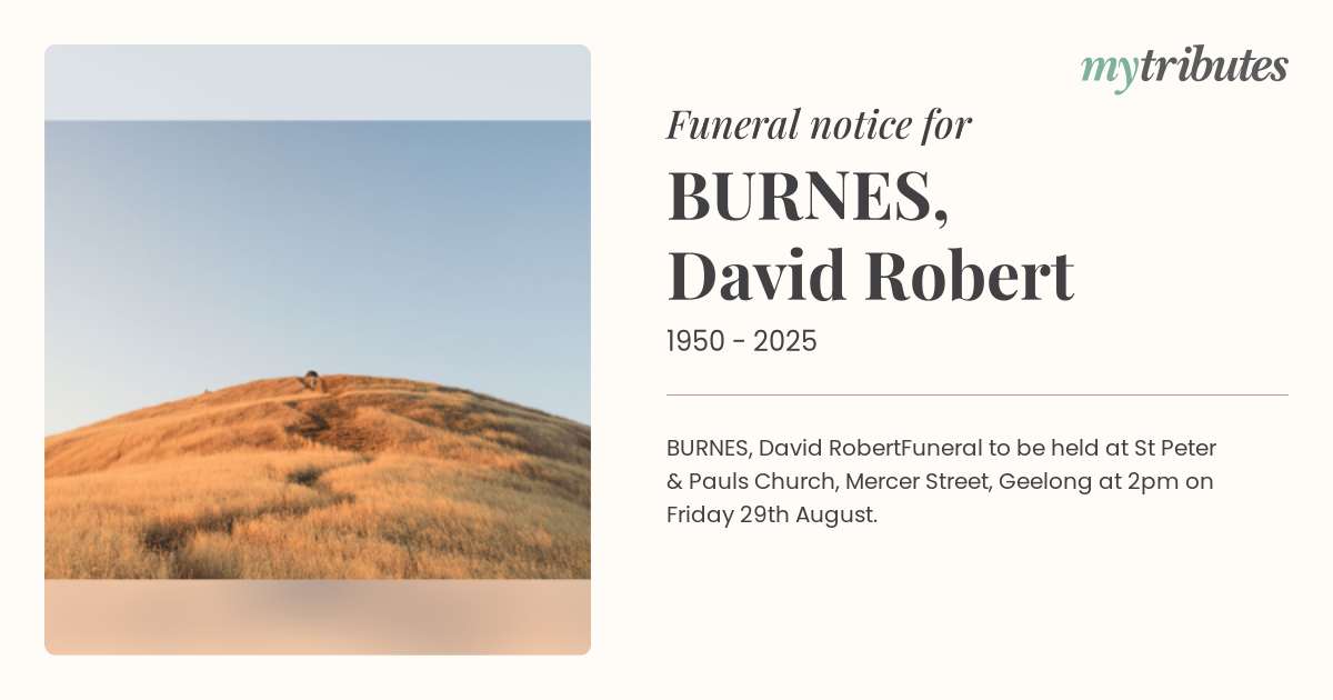 Funeral to be held at St Peter & Paul’s Church, Mercer Street, Geelong at 2pm on Friday 29th August.