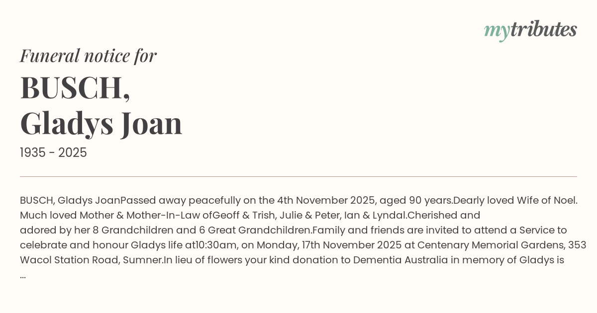 In lieu of flowers your kind donation to Dementia Australia in memory of Gladys is appreciated.