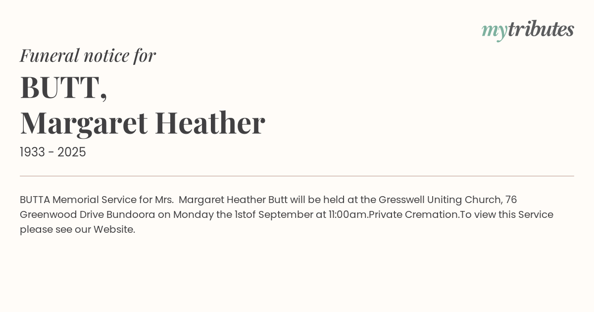 A Memorial Service for Mrs. Margaret Heather Butt will be held at the Gresswell Uniting Church, 76 Greenwood Drive Bundoora on Monday the 1st of September at 11:00am.