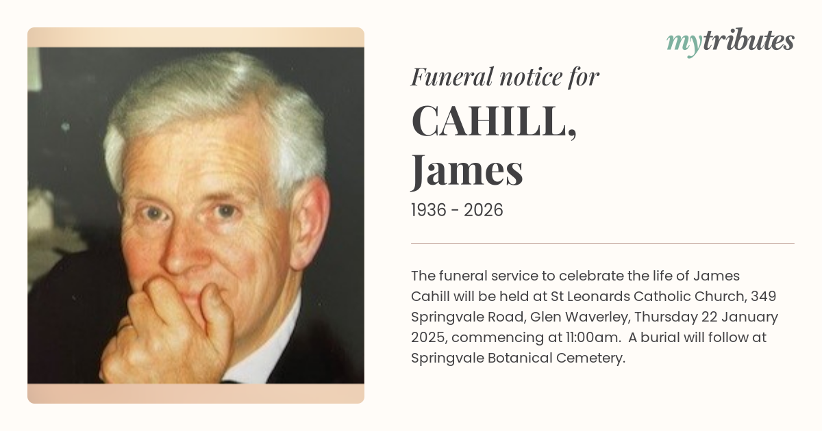 18°CThe funeral service to celebrate the life of James Cahill will be held at St Leonards Catholic Church, 349 Springvale Road, Glen Waverley, Thursday 22 January 2025, commencing at 11:00am.