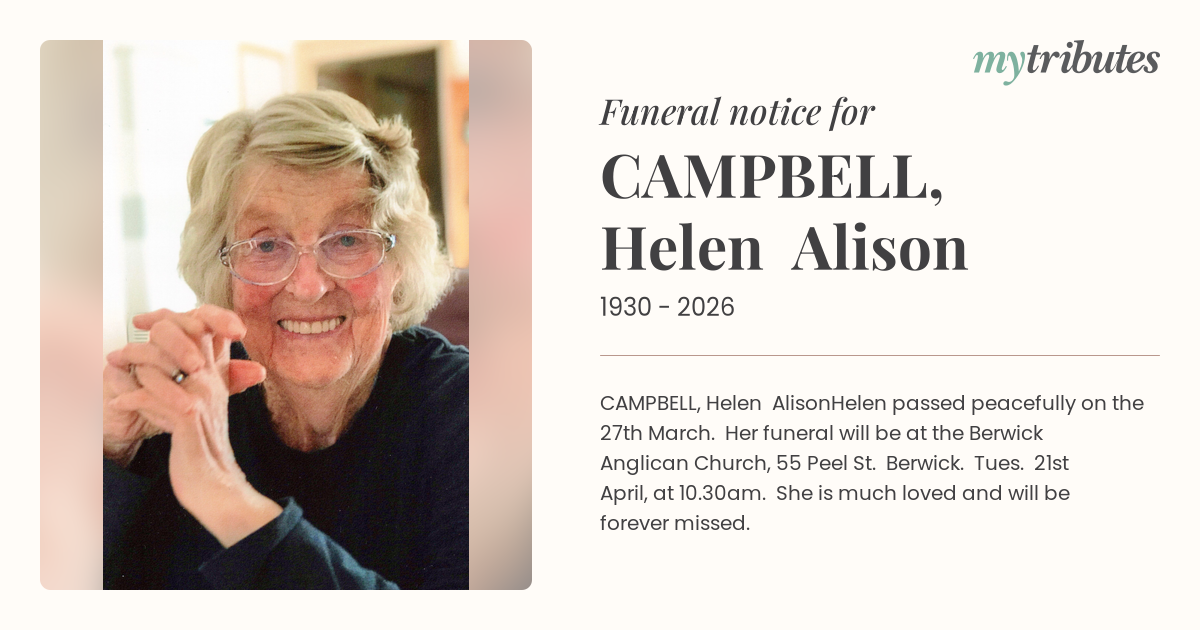 Helen passed peacefully on the 27th March. Her funeral will be at the Berwick Anglican Church, 55 Peel St. Berwick. Tues. 21st April, at 10.30am. She is much loved and will be forever missed.