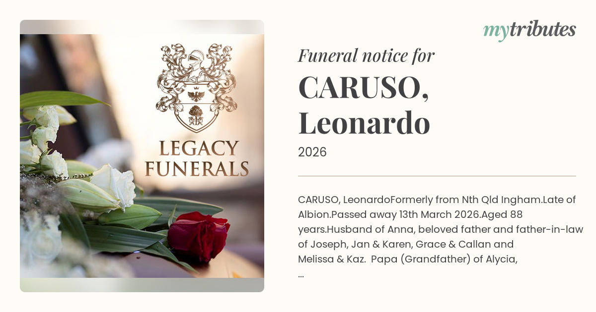 Husband of Anna, beloved father and father-in-law of Joseph, Jan & Karen, Grace & Callan and Melissa & Kaz. Papa (Grandfather) of Alycia, Lauren, Ryan, Rose, Leo and Georgia. Great Grandfather of Harrison and Arthur. Son of Giuseppe and Orazia Caruso (both dec), brother of Rosario and Nardina (both dec).