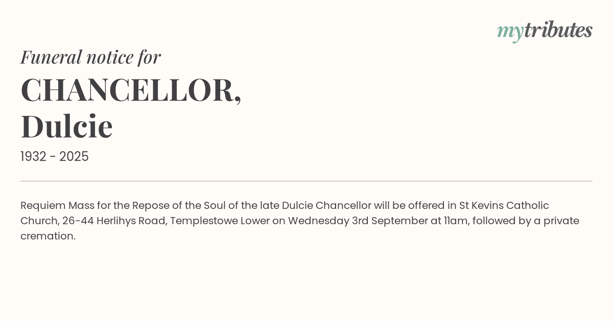 18°CRequiem Mass for the Repose of the Soul of the late Dulcie Chancellor will be offered in St Kevin’s Catholic Church, 26-44 Herlihys Road, Templestowe Lower on Wednesday 3rd September at 11am, followed by a private cremation.