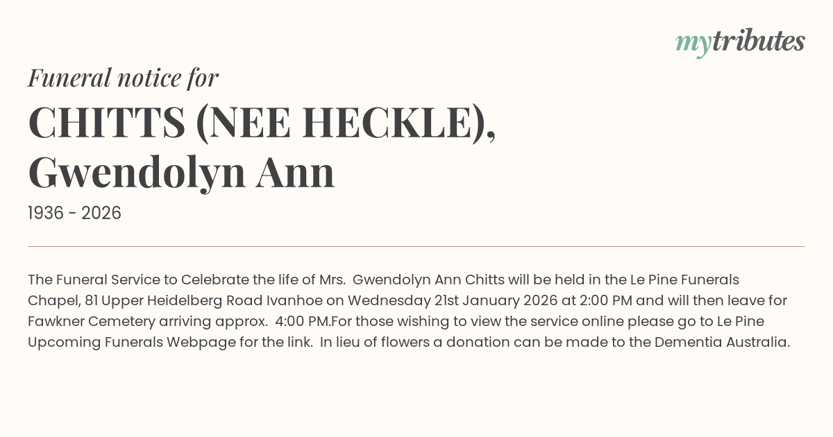 18°CThe Funeral Service to Celebrate the life of Mrs. Gwendolyn Ann Chitts will be held in the Le Pine Funerals Chapel, 81 Upper Heidelberg Road Ivanhoe on Wednesday 21st January 2026 at 2:00 PM and will then leave for Fawkner Cemetery arriving approx. 4:00 PM.