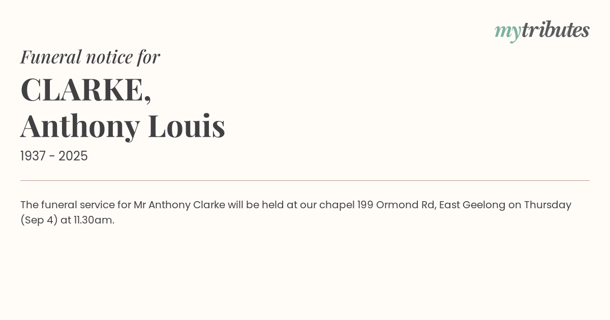 18°CThe funeral service for Mr Anthony Clarke will be held at our chapel 199 Ormond Rd, East Geelong on Thursday (Sep 4) at 11.30am.