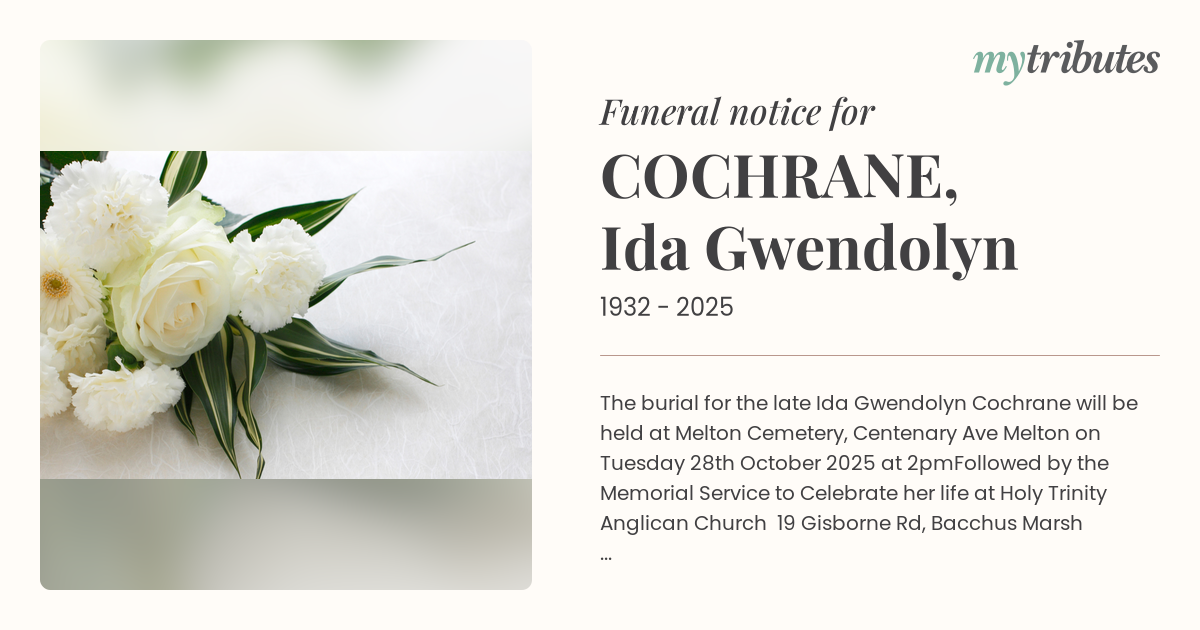18°CThe burial for the late Ida Gwendolyn Cochrane will be held at Melton Cemetery, Centenary Ave Melton on Tuesday 28th October 2025 at 2pm