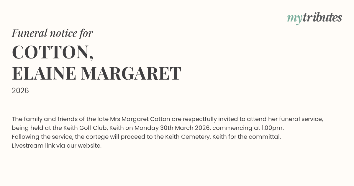 18°CThe family and friends of the late Mrs Margaret Cotton are respectfully invited to attend her funeral service, being held at the Keith Golf Club, Keith on Monday 30th March 2026, commencing at 1:00pm.