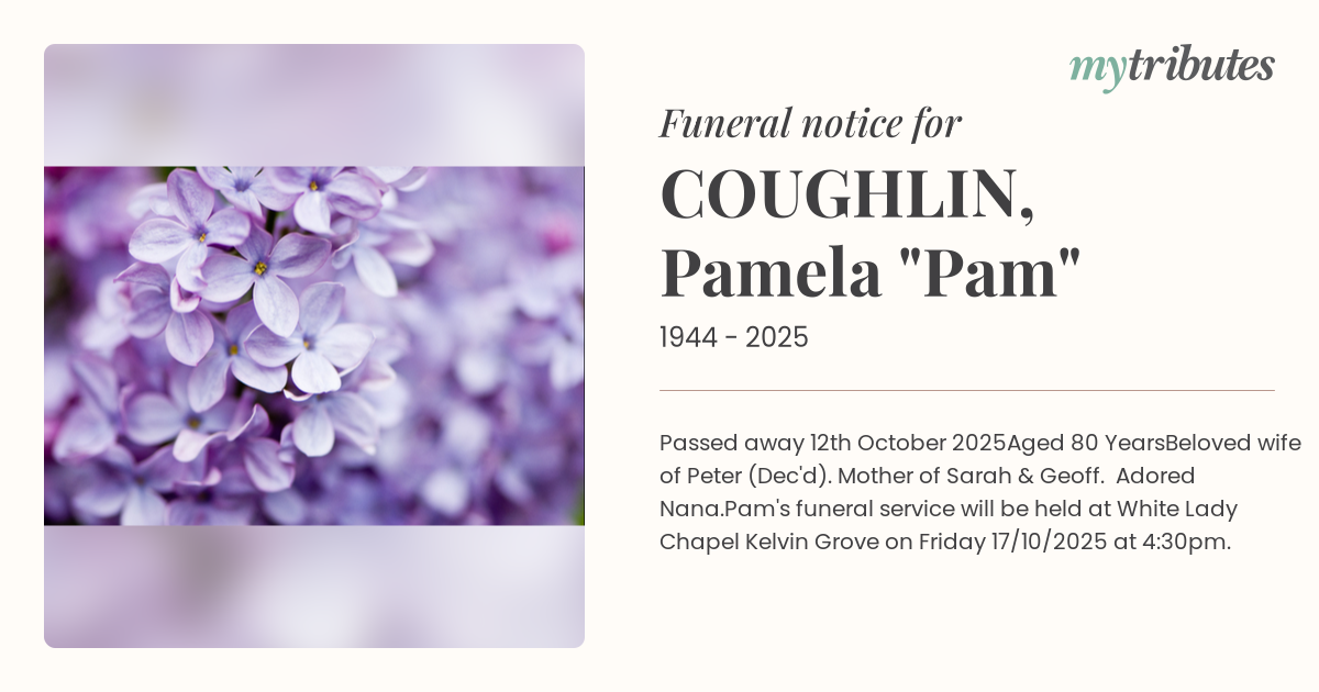 Pam's funeral service will be held at White Lady Chapel Kelvin Grove on Friday 17/10/2025 at 4:30pm.