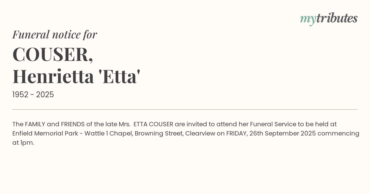 18°CThe FAMILY and FRIENDS of the late Mrs. ETTA COUSER are invited to attend her Funeral Service to be held at Enfield Memorial Park - Wattle 1 Chapel, Browning Street, Clearview on FRIDAY, 26th September 2025 commencing at 1pm.