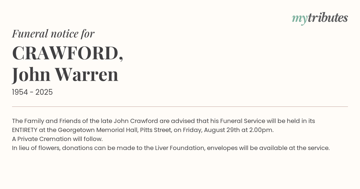 18°CThe Family and Friends of the late John Crawford are advised that his Funeral Service will be held in its ENTIRETY at the Georgetown Memorial Hall, Pitts Street, on Friday, August 29th at 2.00pm.