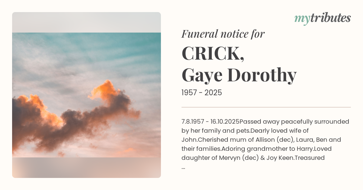 Family and friends of Gaye are warmly invited to attend a service to celebrate her life, to be held on Wednesday the 22nd of October 2025 at
