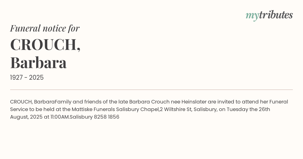 Family and friends of the late Barbara Crouch nee Heinslater are invited to attend her Funeral Service to be held at