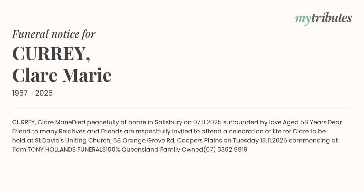 Relatives and Friends are respectfully invited to attend a celebration of life for Clare to be held at St David's Uniting Church, 68 Orange Grove Rd, Coopers Plains on Tuesday 18.11.2025 commencing at 11am.