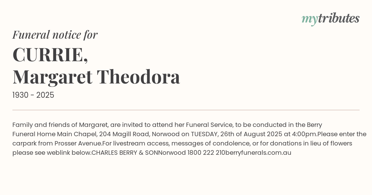 18°CFamily and friends of Margaret, are invited to attend her Funeral Service, to be conducted in the Berry Funeral Home Main Chapel, 204 Magill Road, Norwood on TUESDAY, 26th of August 2025 at 4:00pm.