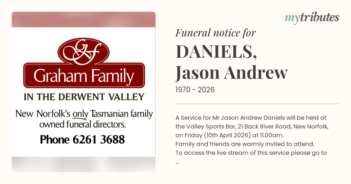 18°CA Service for Mr Jason Andrew Daniels will be held at the Valley Sports Bar, 21 Back River Road, New Norfolk, on Friday (10th April 2026) at 11.00am.