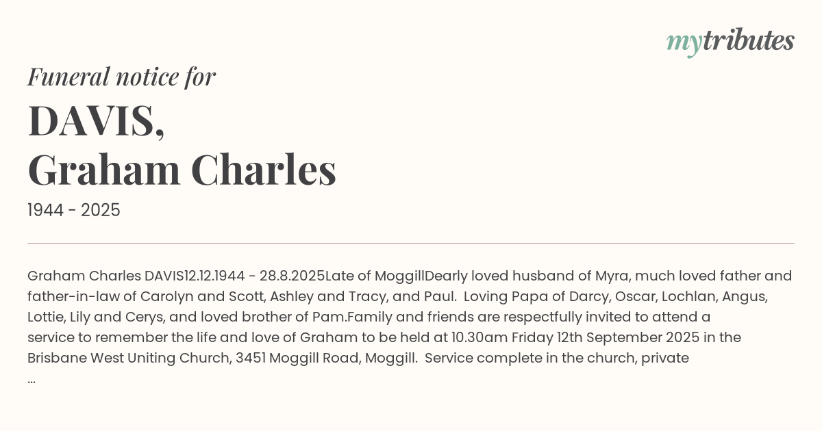 Family and friends are respectfully invited to attend a service to remember the life and love of Graham to be held at 10.30am Friday 12th September 2025 in the Brisbane West Uniting Church, 3451 Moggill Road, Moggill. Service complete in the church, private cremation.