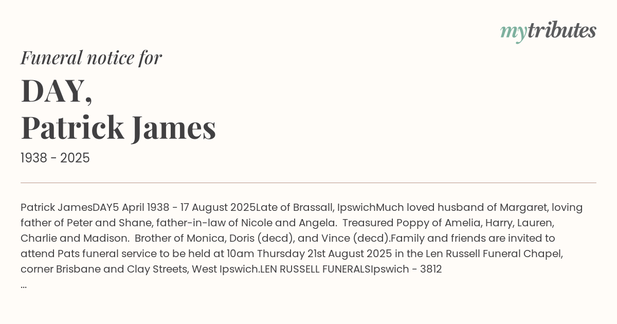 Family and friends are invited to attend Pat’s funeral service to be held at 10am Thursday 21st August 2025 in the Len Russell Funeral Chapel, corner Brisbane and Clay Streets, West Ipswich.
