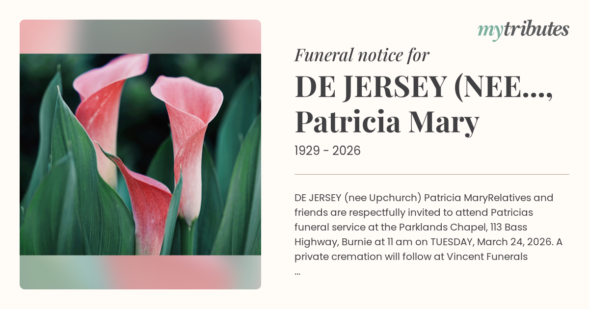 Relatives and friends are respectfully invited to attend Patricia’s funeral service at the Parklands Chapel,