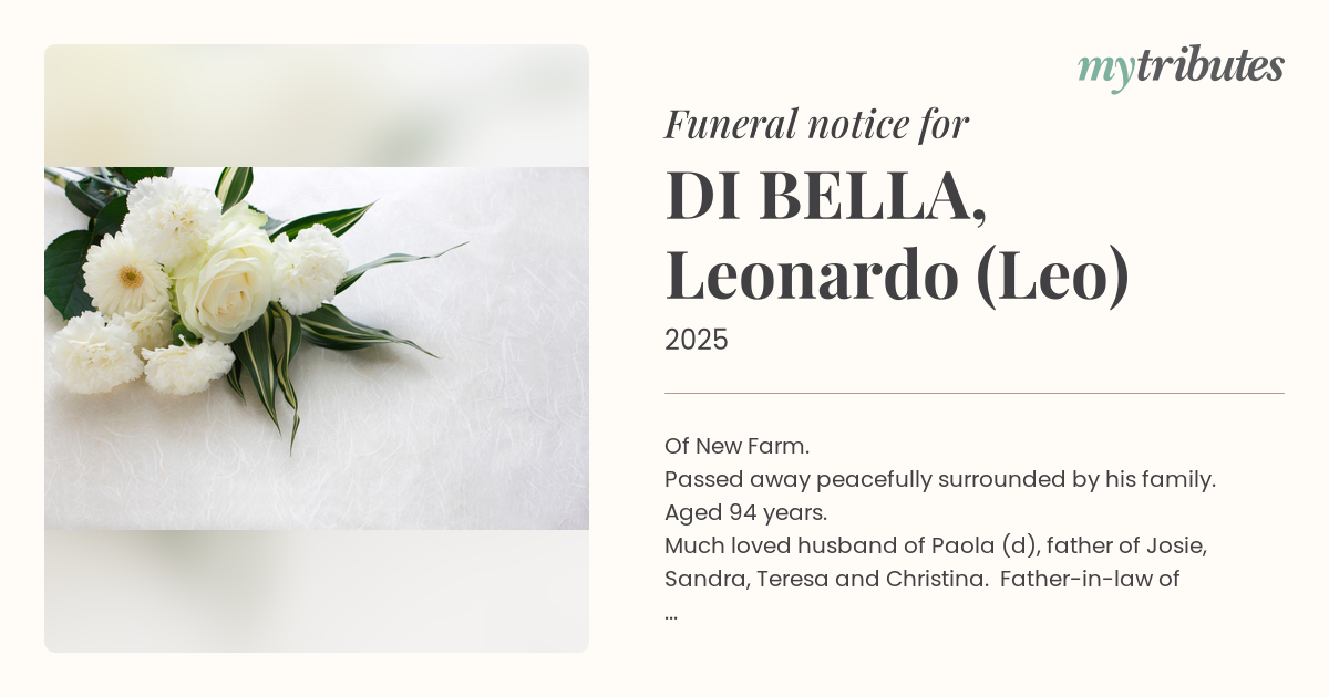Much loved husband of Paola (d), father of Josie, Sandra, Teresa and Christina. Father-in-law of Roberto, Marco, John and Giuseppe. Adored nonno & bisnonno. Loved brother, brother-in-law, uncle and friend to many.