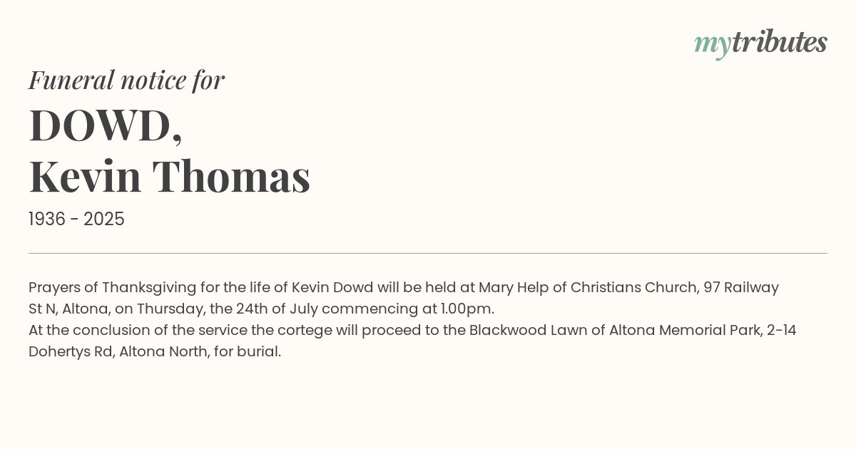 18°CPrayers of Thanksgiving for the life of Kevin Dowd will be held at Mary Help of Christians Church, 97 Railway St N, Altona, on Thursday, the 24th of July commencing at 1.00pm.