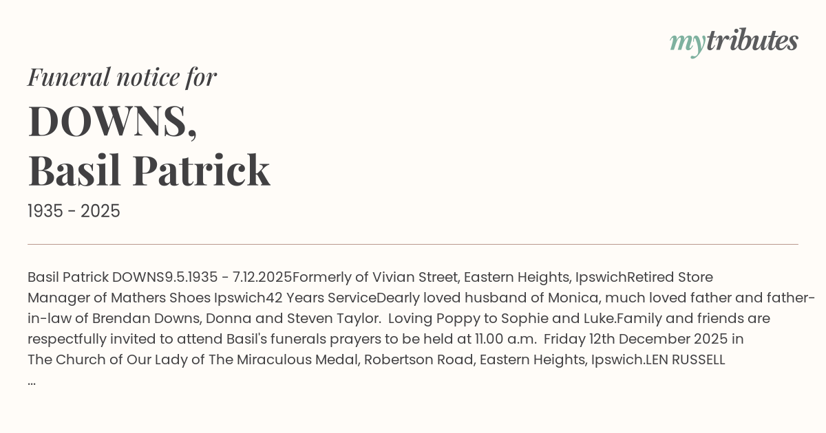 Family and friends are respectfully invited to attend Basil's funerals prayers to be held at 11.00 a.m. Friday 12th December 2025 in The Church of Our Lady of The Miraculous Medal, Robertson Road, Eastern Heights, Ipswich.